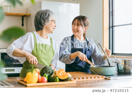 家のキッチンで一緒に料理・家事・自炊をする笑顔のアジア人高齢者女性と若い女性(家政婦・家事代行)