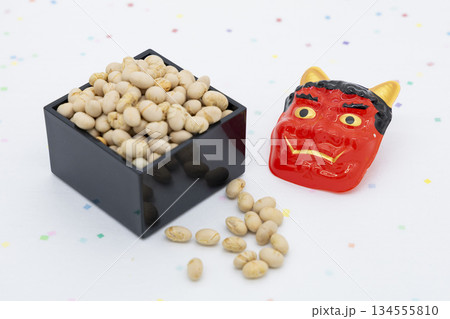 節分の豆まき、赤鬼のイラストお面と一升枡に入った福豆、赤い布の上にある