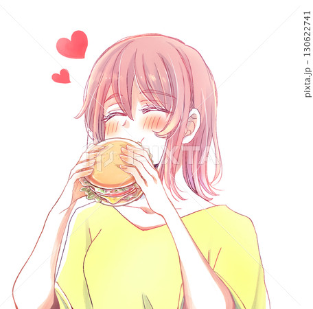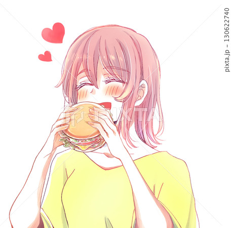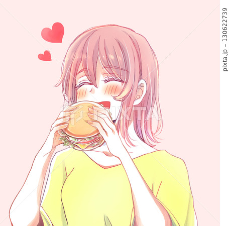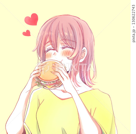 ハンバーガーを嬉しそうに頬張るぽっちゃりした女性 もぐもぐ