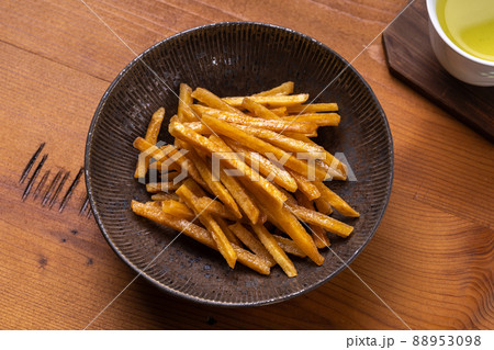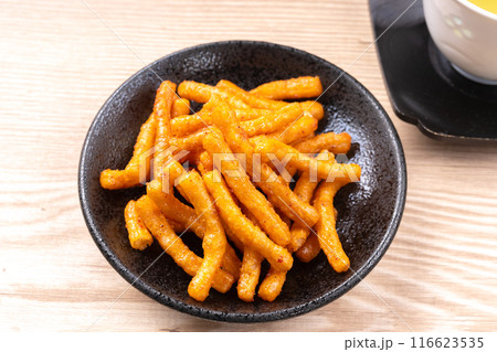 木のお皿に入ったかりんとう、生姜煎餅などの和菓子(お茶菓子) と日本茶