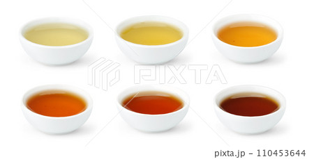 Brewed Chinese teas of different color in white bowls isolated on white background