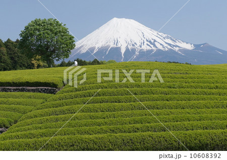 (静岡県)新緑が美しい茶畑越しに、富士山