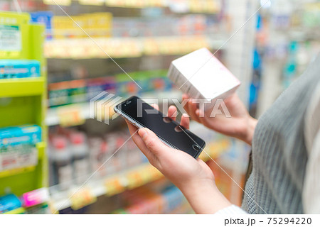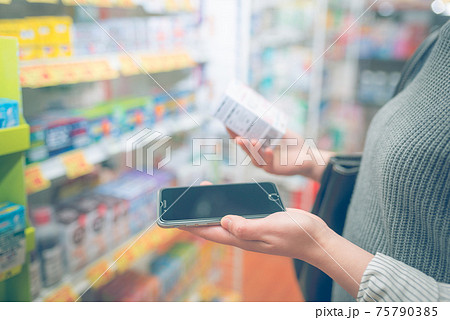 薬局・ドラッグストア・コンビニエンスストアでスマホを見ながら化粧品・コスメの買い物をする女性