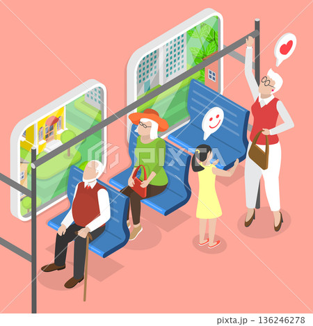 3D Isometric Flat Vector Illustration of Courteous Kid, Young Girl Shows Respect By Offering Seat To Elderly Woman