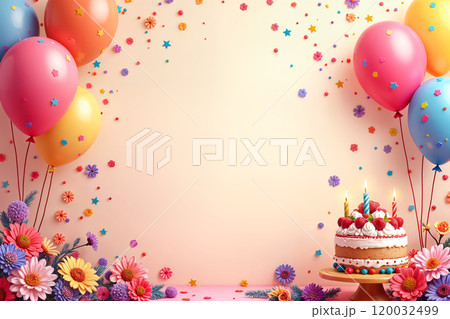 Vector illustration of a festive birthday cake with colorful balloons, confetti and a cake.
