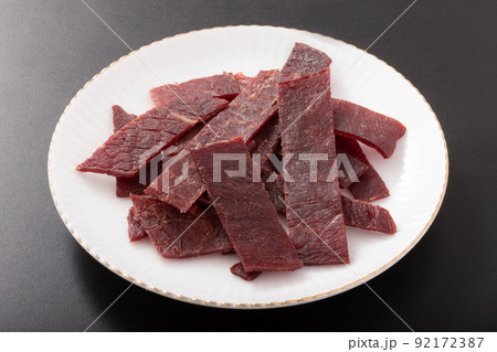 スレートプレートにのせられたビーフジャーキー。