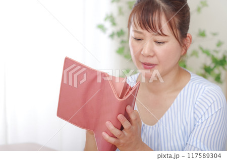困り顔でお財布を持つミドル女性