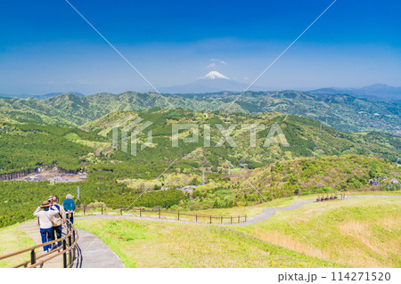 (静岡県)新緑の大室山・山頂の景観と後方に富士山