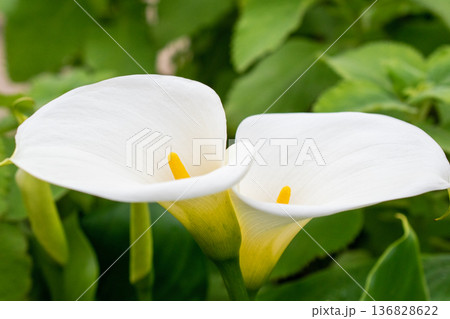 Beautiful white Calla Lilies flowers in a garden after the rain.