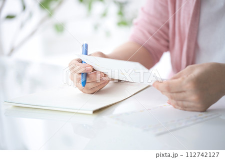 手紙を書くミドル女性の手元