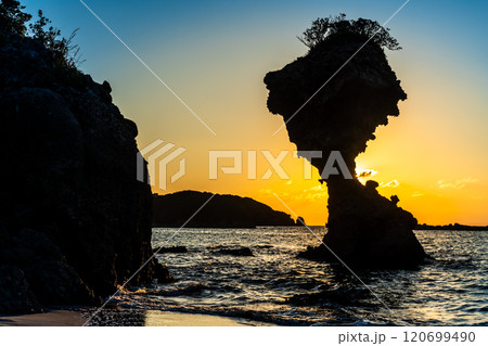 りんご岩(傘岩)の夕陽 柿泊海岸 ながさきサンセットロード 【長崎市】