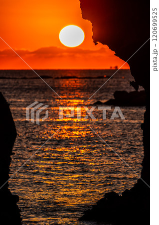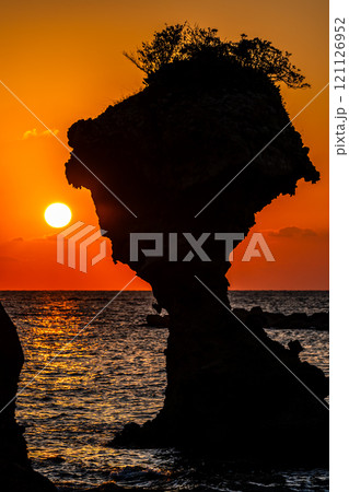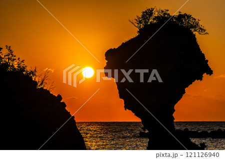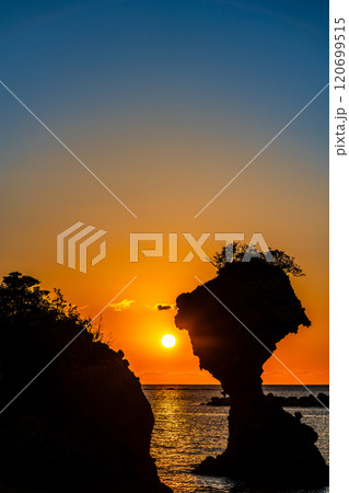 りんご岩(傘岩)の夕陽 柿泊海岸 ながさきサンセットロード パノラマ 【長崎市】