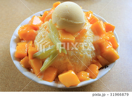 果肉入りのマンゴーシロップがたっぷりとかかったかき氷を白背景で撮影