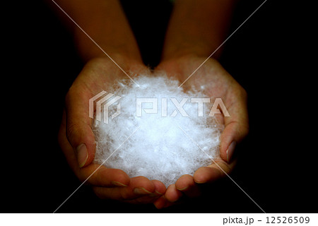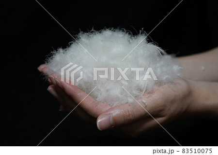 水鳥のふんわりした羽毛を手で包み込んだイメージ写真
