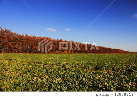 【夕方のセブンスターの木からの十勝岳連峰 秋の風景】