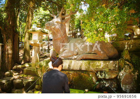 奈良県奈良市、古い石灯籠が並ぶ春日大社の参道と鹿