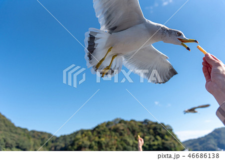 カモメが飛びながら餌をキャッチする瞬間