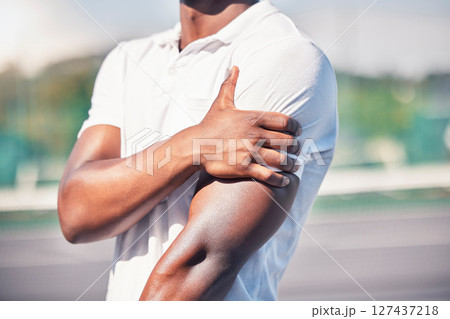 Black man, hand and arm pain from healthcare accident or medical wellness emergency outdoor. African person, shoulder injury and broken bone, hurt muscle or arthritis during fitness workout on court