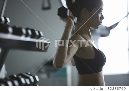 a portrait of a woman lifting the dumbbell over the shoulder