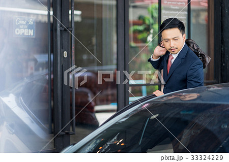 A businessman is carrying his bag over his shoulder and looking at the car.