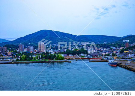 小樽港を出港中の新日本海フェリー「あざれあ」よりルタオ本店方面の街並みを望む