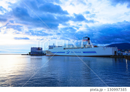 かつない臨海公園より夜明けの小樽フェリーターミナルに停泊中の新日本海フェリー「あざれあ」を望む