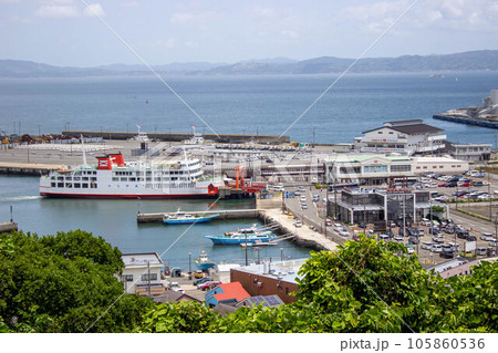 くりはま花の国から見た久里浜港に停泊する東京湾フェリーかなや丸とフェリーターミナル