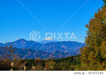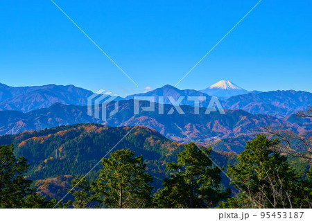 秋の快晴の高尾山山頂から見える富士山、大室山など