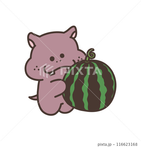 スイカを持ったかわいいカバのイラスト