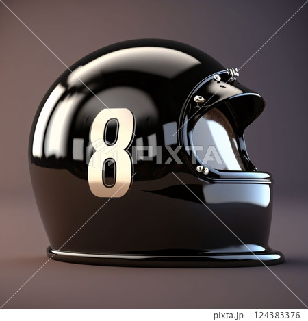 Black helmet with number 8 on a gray background. 3d illustration