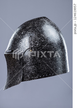 Darkened Steel Medieval Knight Helmet. Battle-worn head protection with narrow eye slits.