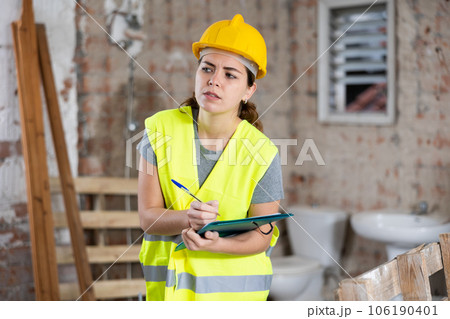 A female construction worker or engineer wearing earmuffs, headphones holds a protective helmet. Clothing for construction workers and other.