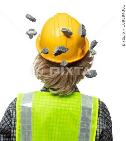Back view caucasian blonde hair construction industrial worker wear yellow hard hat safety vast. Gravel stone sands supply fall down into head of engineer as accident. White background isolated