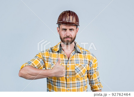 guarantee quality. man architect with thumb up. guy wear worker uniform. handsome builder in helmet. mature man wear checkered shirt. professional constructor or mechanic. successful builder engineer