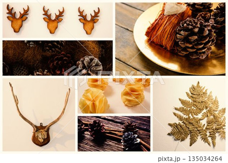 Autumn holiday flat design collage is showing wooden reindeer silhouettes, pinecones, brass plate