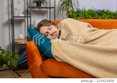 Tired young man lying down on comfortable couch, taking a rest, daytime nap relaxing falling asleep