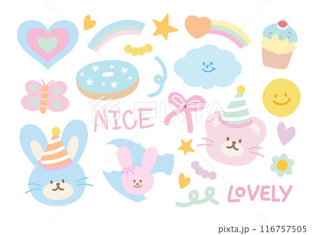 Pastel illustration of bunny, teddy bear, rainbow, heart, butterfly, donut, cupcake, party hat, cloud for cartoon character, comic, mascot, sweet dessert, cute patches, shirt print, easter, animal, ad