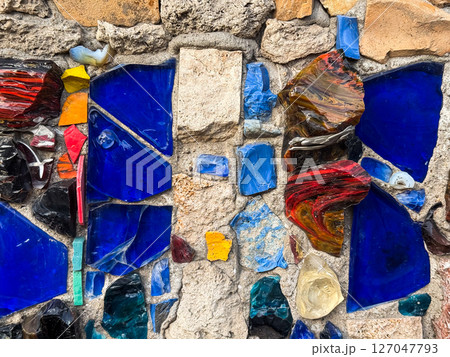 Vibrant mosaic of polished glass and stone embedded in concrete. The composition captures the essence of handcrafted urban design and textured contrast.