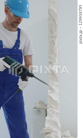 Male construction worker demolishing white wall with rotary hammer drill, wearing blue overalls and protective white gloves, closeup view