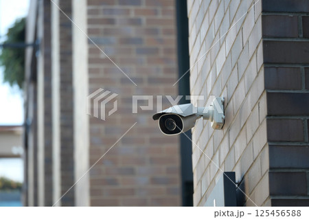 Security camera mounted on a brick wall in an urban area