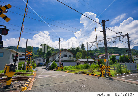 踏切のある夏景色 雄大な夏雲と竹の下踏切