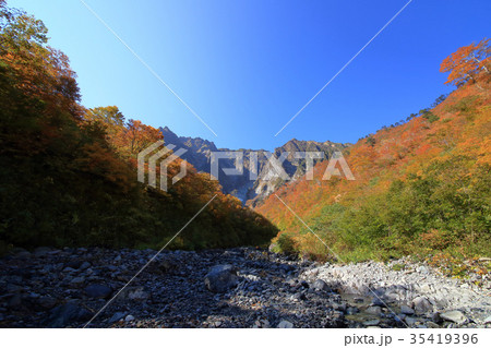 秋の群馬県みなかみ町の一ノ倉沢から谷川岳の岩壁を見る