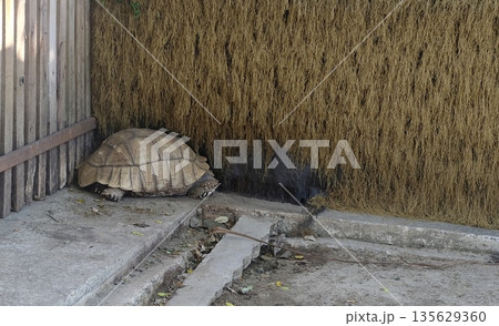 A large Sulcata tortoise with brown shell stands beside a wooden fence in a dry grassy area, near a small hole, in a wildlife sanctuary or zoo environment mimicking African savannah habitat.