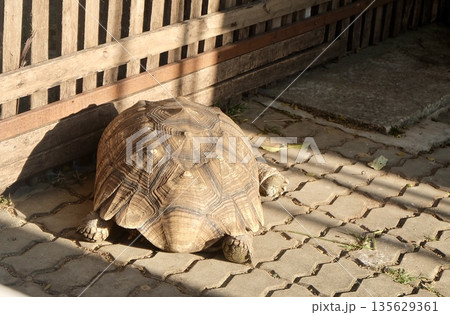 A large African spurred Sulcata tortoise with a brown shell stands beside a wooden fence in a dry grassy outdoor setting, showcasing its natural habitat in a wildlife sanctuary environment with rocks