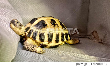 ベッドに穴を開けて満足そうなロシアリクガメ