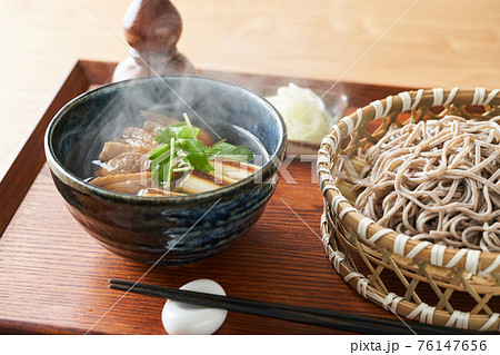 ロースト鴨肉と焼長葱と三つ葉の入った鴨せいろ蕎麦を白背景で撮影