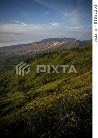 朝の太陽に照らされて輝く峠の草原と山の向こうに青空が広がる
