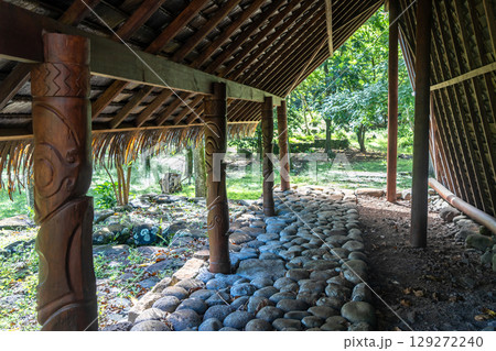 Thatched-roof building at Kamuihei archaeological site, Nuku Hiva, Marquesas Islands. French Polynesia