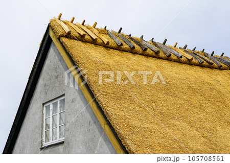 Closeup of a new thatched roof of a historic house, wooden strengthening of the roof ridge