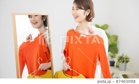 鏡の前で服選びをしている若い女性 ファッションイメージ